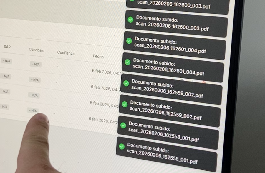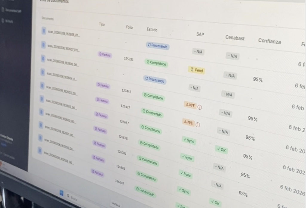 El núcleo del proyecto fue un desarrollo especializado sobre SAP, construido para operar en tiempo real mediante integración vía Service Layer. El sistema incorpora tecnología de escaneo de alta velocidad y lectura inteligente con IA OCR, capaz de interpretar guías y facturas, extraer automáticamente datos clave como número de documento, fecha y tipo, y procesarlos sin digitación manual.